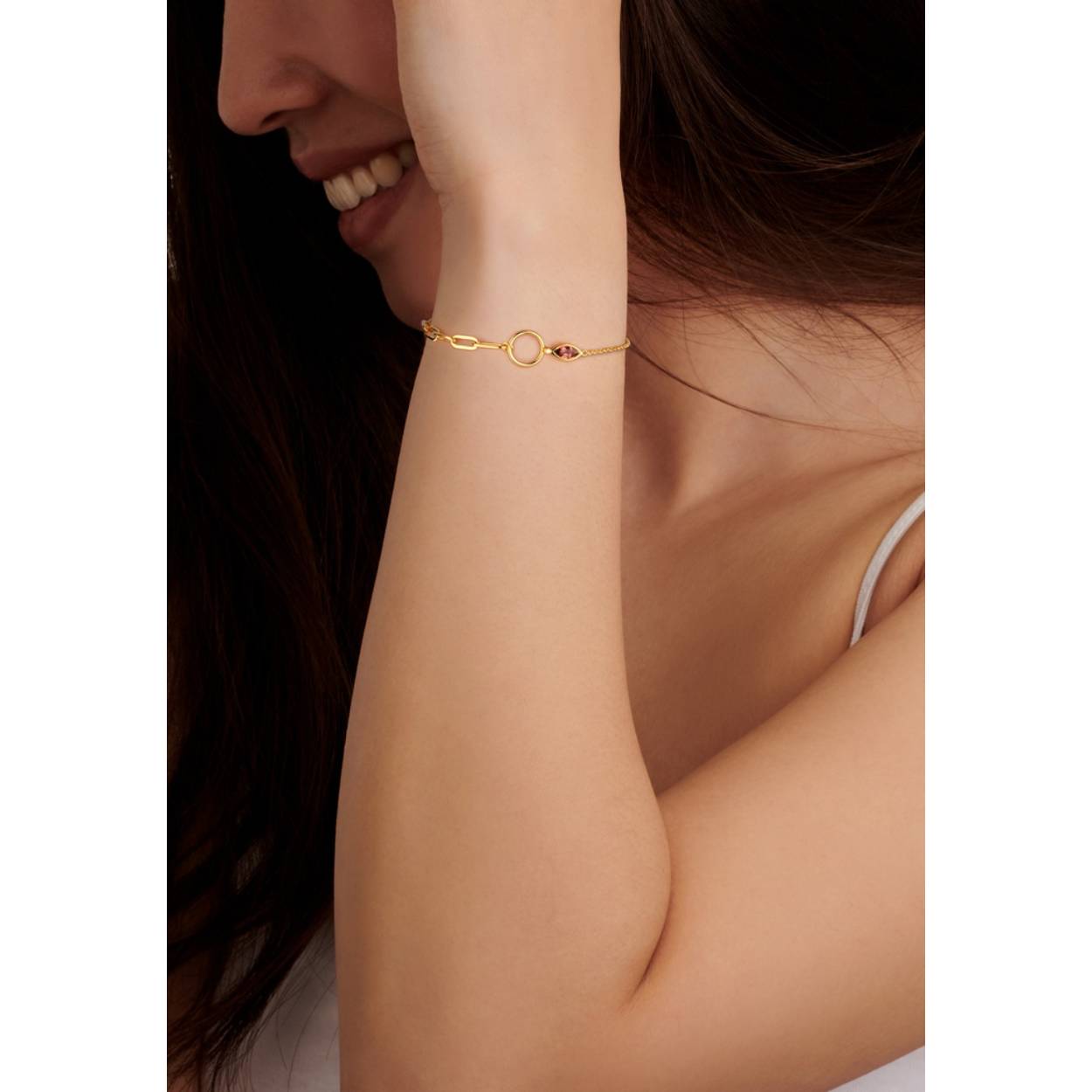 Goudkleurige armband met een écht diamantje en een markies geslepen roze Pyrope granaat