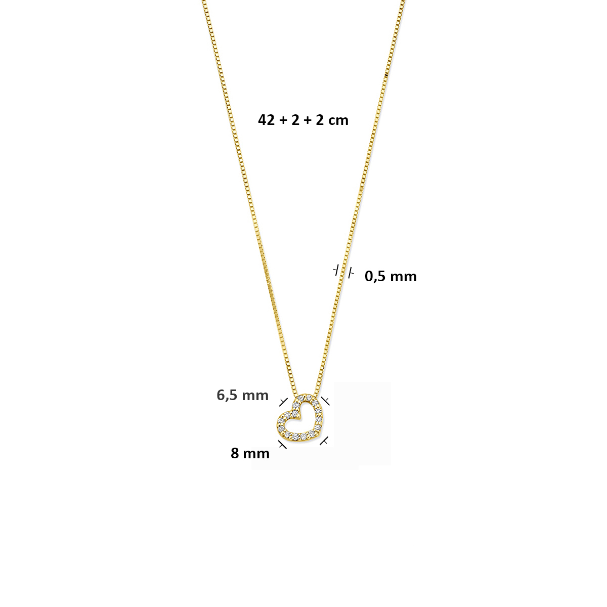 14k Geelgouden collier uitgevoerd met een hartje en lab grown diamant. Het collier heeft draaglengte van 40cm met 2+2cm extensie. Het totale diamantgewicht is 0.08ct.
