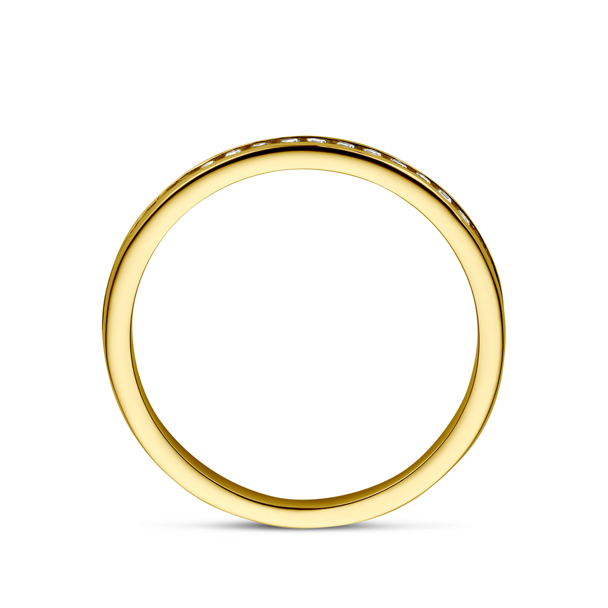 Stijlvolle geelgouden aanschuifring met een schitterende rij van zirkonia en een poli afwerking. Tip: Combineer deze ring met andere aanschuifringen voor een subtiele en elegante look.