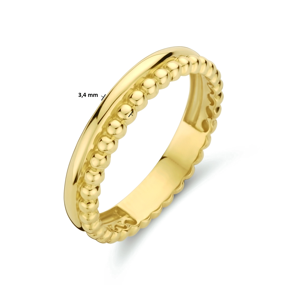 14k Geelgouden ring uitgevoerd met bolletjes. De ring heeft een breedte van 3.4mm.