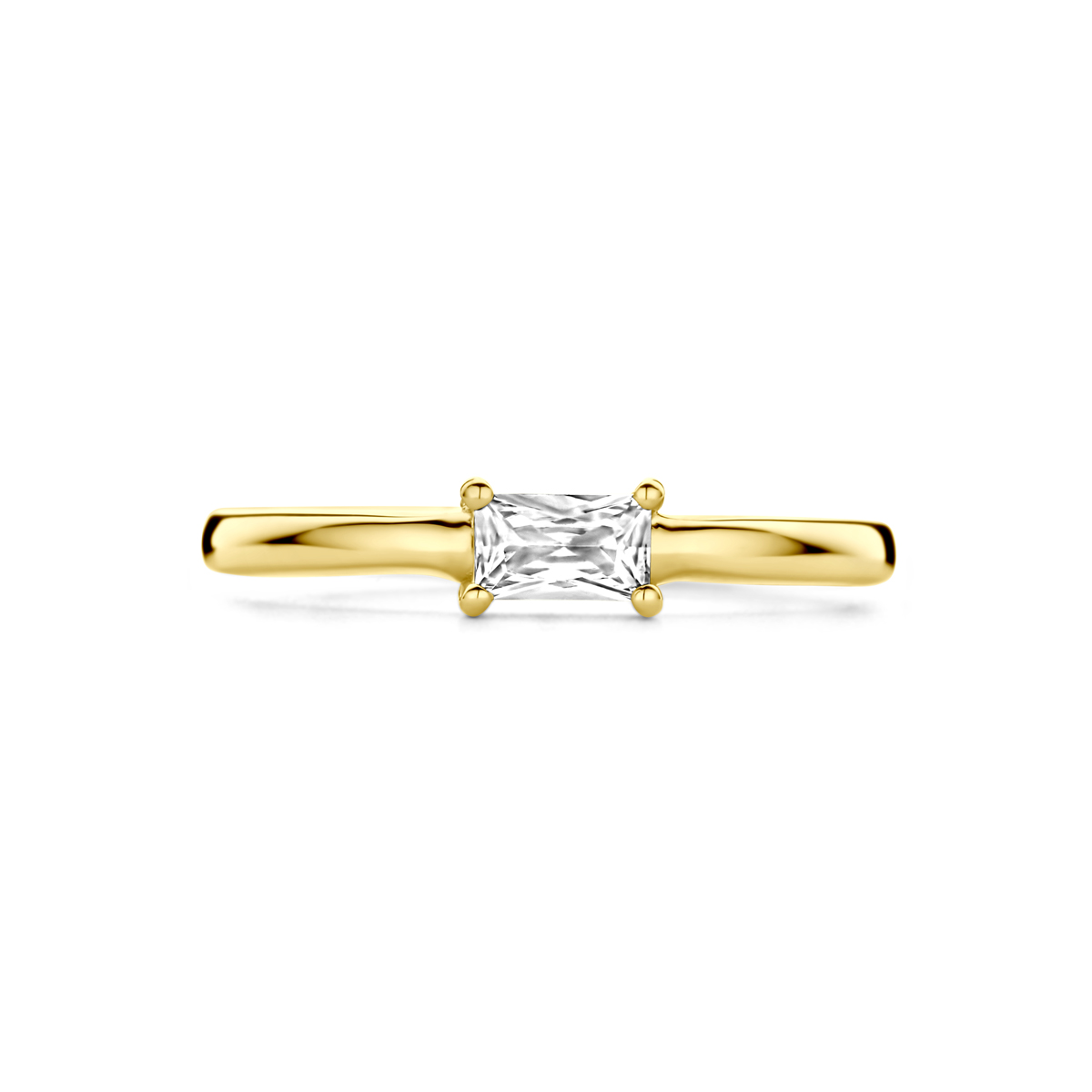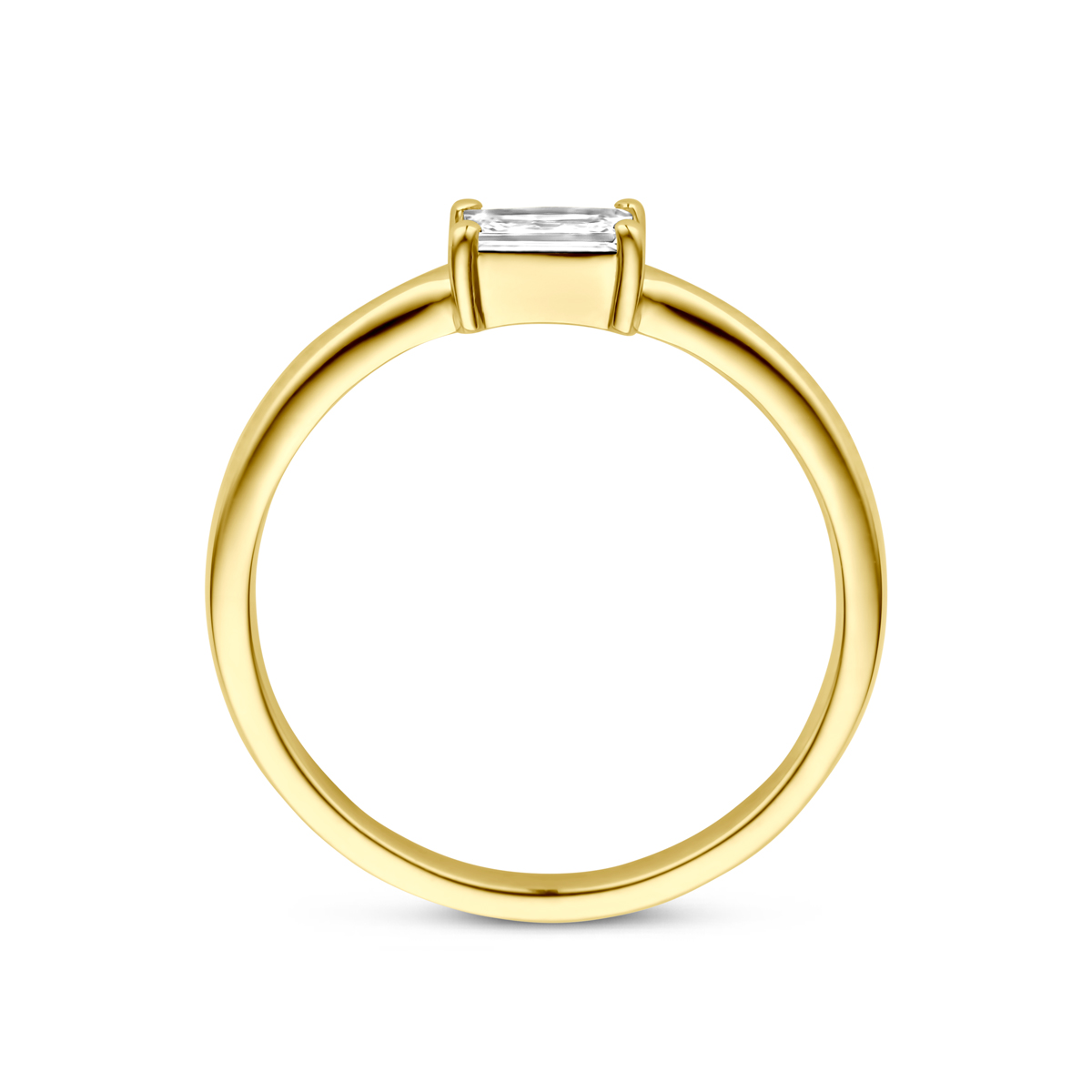14k Geelgouden ring uitgevoerd met zirkonia. De ring heeft een breedte van 4mm.
