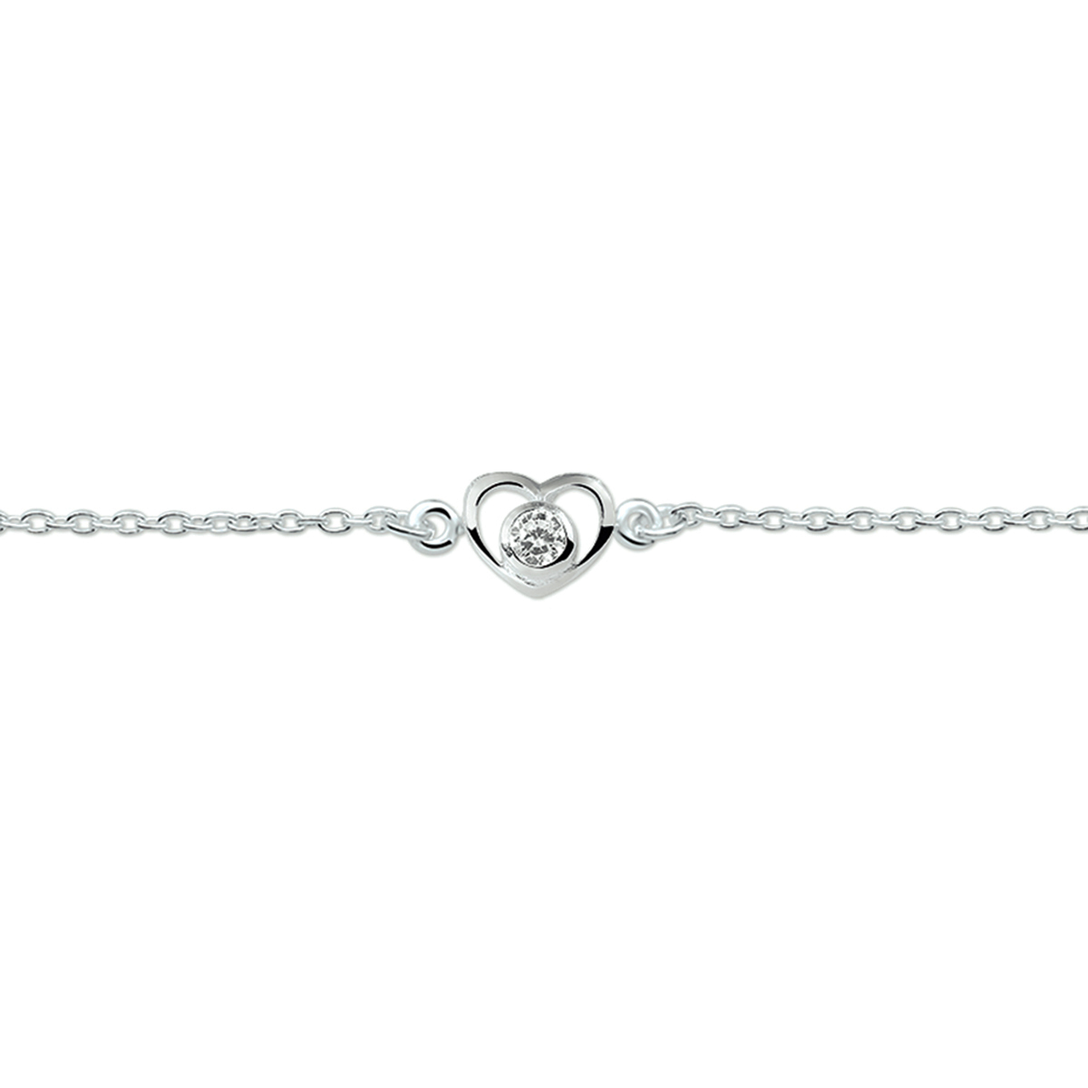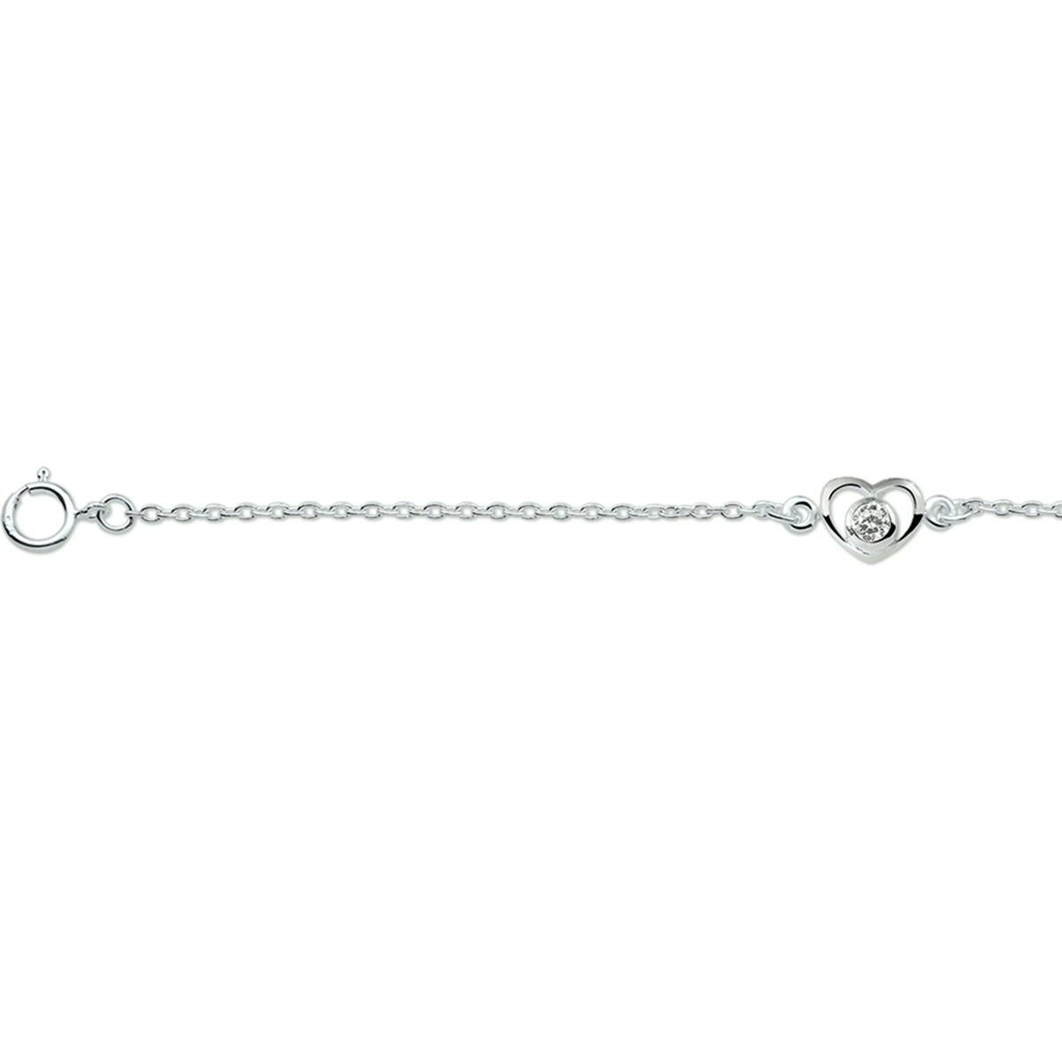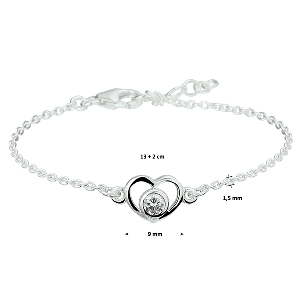 Beschrijving: Zilveren armband met een open hart en zirkonia. De lengte bedraagt 13cm met 2cm extensie. De schakelbreedte bedraagt 1.5mm.