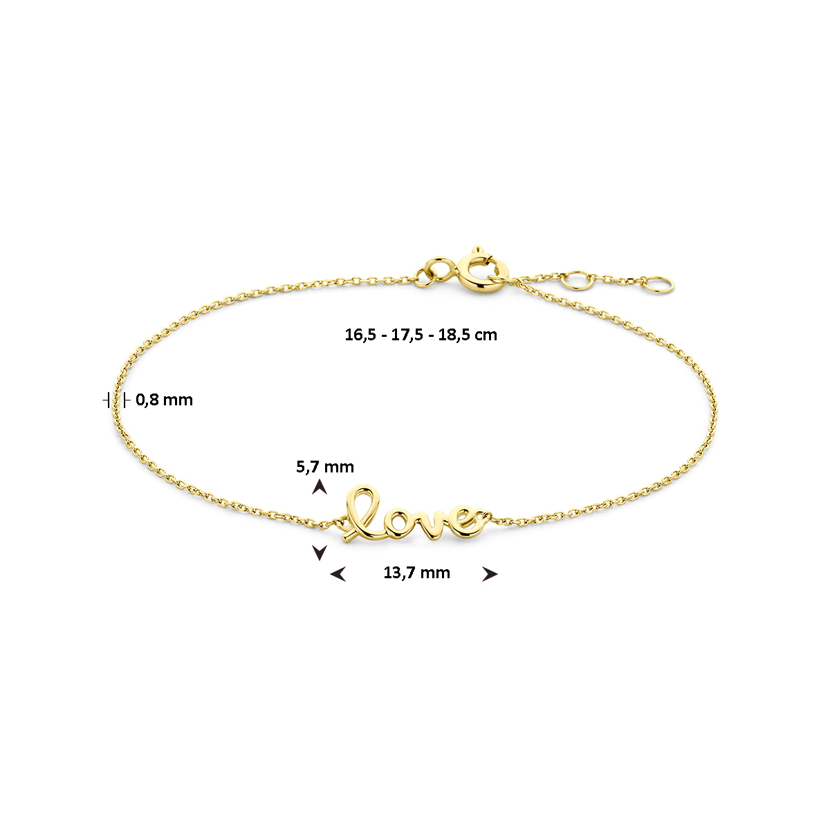 14k Geelgouden armband uitgevoerd met de tekst love. De armband heeft draaglengtes van 16.5, 17.5 en 18.5cm. De schakelbreedte is 0.8mm.