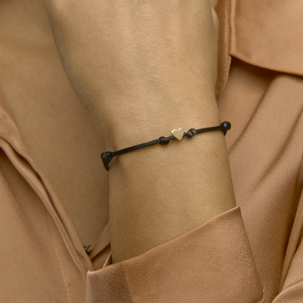 Zwart gevlochten armband uitgevoerd met een 14k geelgouden hartje. De armband heeft draaglengtes van 13 tot 26cm. Het hartje heeft een afmeting van 5x5.5mm.