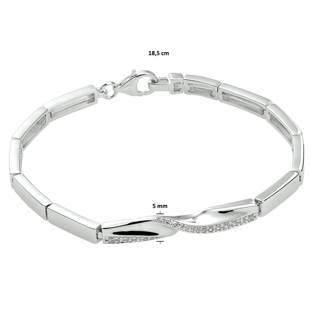 Beschrijving: Gerhodineerd zilveren armband met een draaglengte van 18.5cm. Met schitterende details zoals de sprankelende rij van zirkonia stenen en de poli afwerking. Uitgevoerd met een stevig karabijn slot. Tip: Combineer deze armband met bijpassende sieraden uit onze collectie.