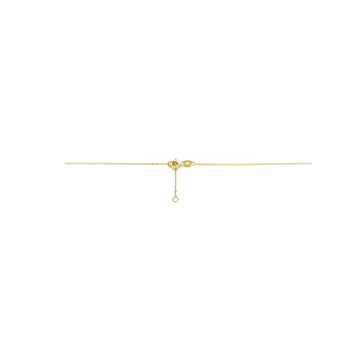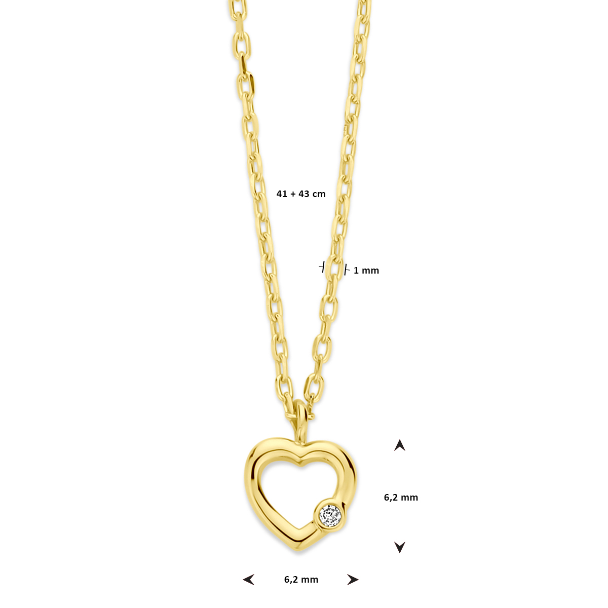 14k Geelgouden collier uitgevoerd met een hart en diamant. Het collier heeft een schakelbreedte van 1mm en draaglengtes van 41 en 43cm.