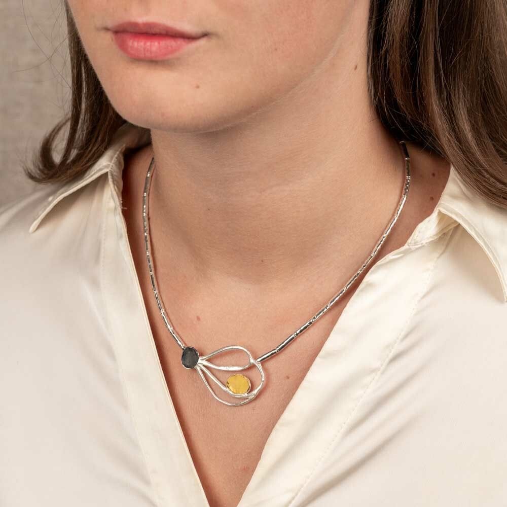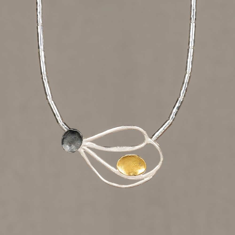 Collier gemaakt van 925 sterling zilveren buisjes in combinatie met een hanger van geoxideerd zilver en verguld. Combineer dit mooie collier met een paar oorsieraden, een armband en ring voor een complete look!