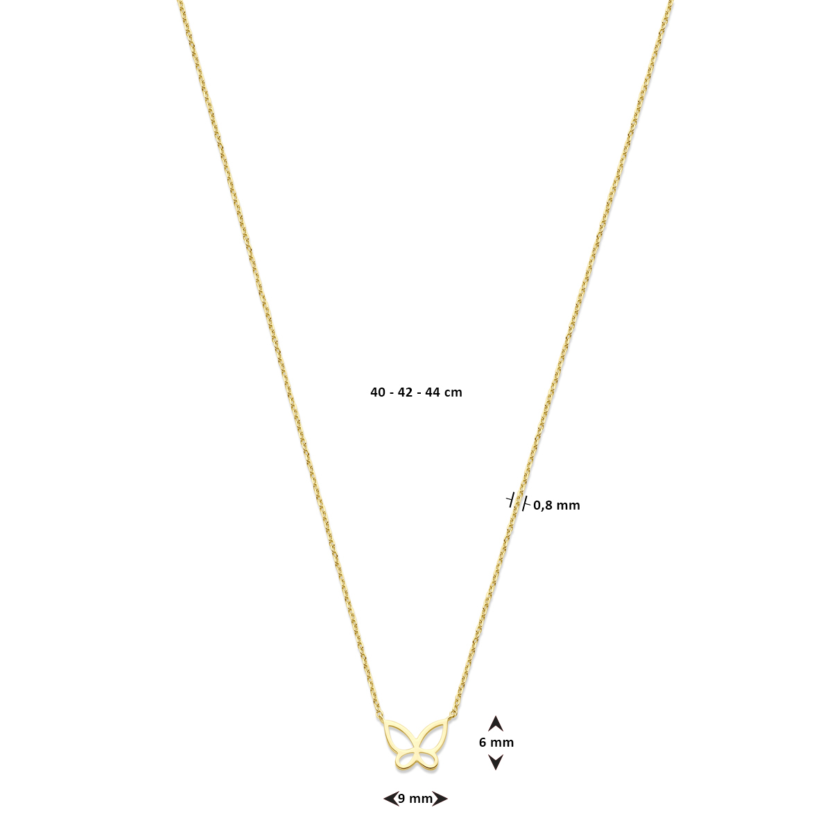 14k Geelgouden collier uitgevoerd met een vlinder. Het collier heeft draaglengtes van 40, 42 en 44cm. De schakelbreedte is 0.8mm. Uitgevoerd met een veerslot.