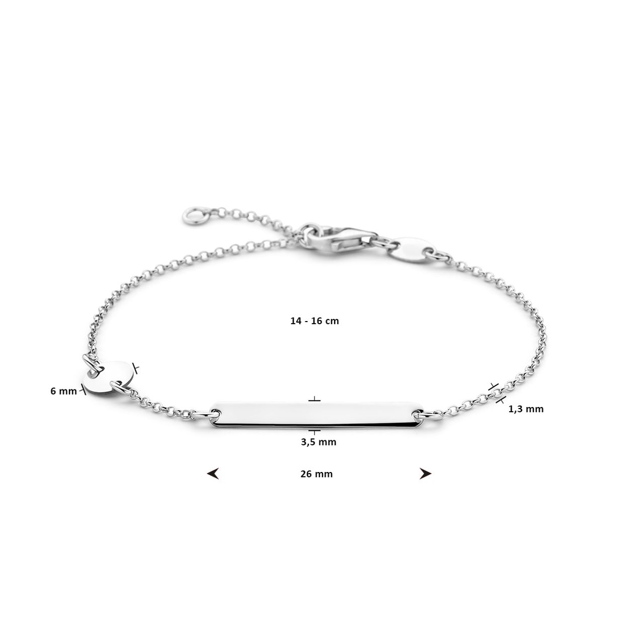 Gerhodineerd 925 zilveren graveerarmband met een plaat van 26x3.5mm en een cirkel. De armband heeft draaglengtes van 14cm en 16cm. De schakelbreedte is 1.3mm en de dikte van de plaat is 0.5mm. Uitgevoerd met een karabijn sluiting.