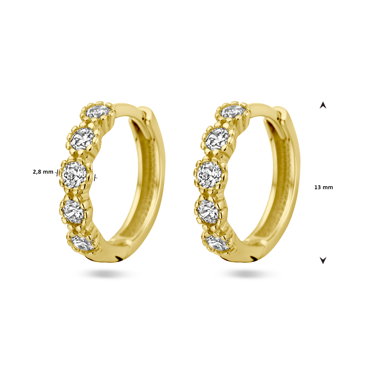 14k Geelgouden klapoorringen uitgevoerd met zirkonia. De klapoorringen hebben een afmeting van 13x2.8mm.