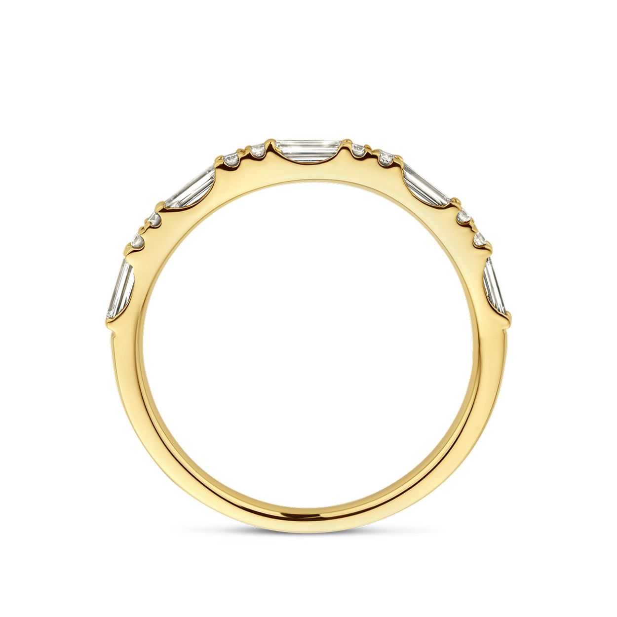 14k Geelgouden ring uitgevoerd met diamanten. De ring heeft een breedte van 2mm.