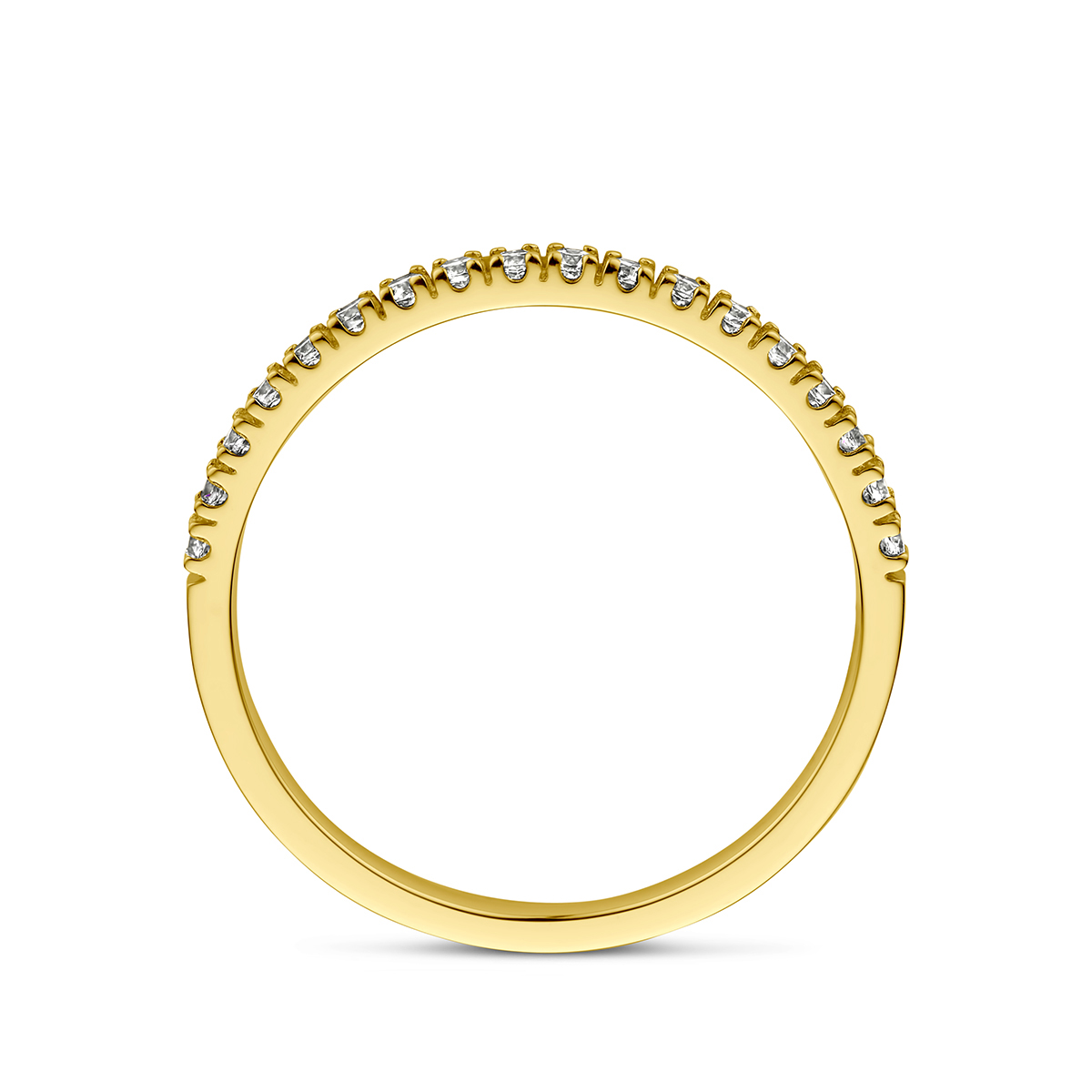 14k Geelgouden ring met geboortesteen uitgevoerd met zirkonia. De ring heeft een breedte van 1.5mm.