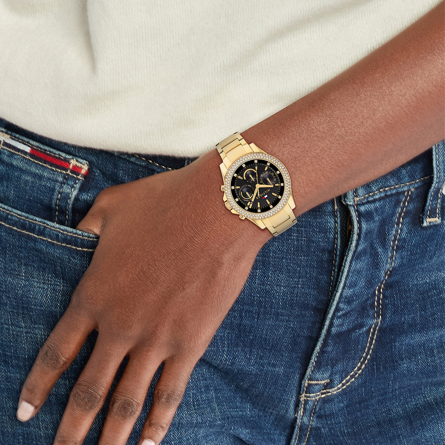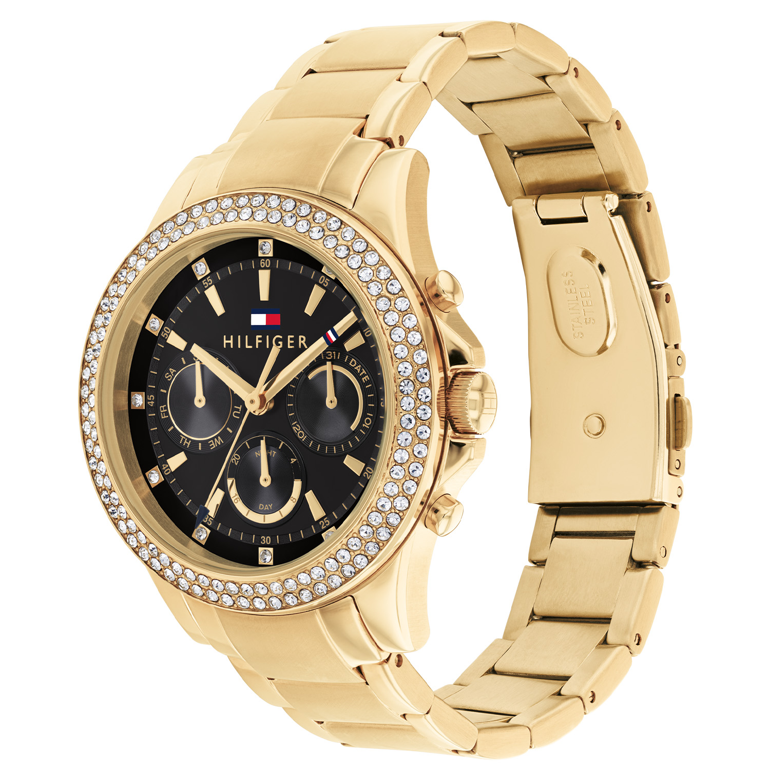 Dit specifieke horloge van Tommy Hilfiger uit de Haven Le serie met artikelnr: TH1782676 is een sportief chic dameshorloge die zeker in je collectie past. Het stalen dameshorloge heeft een ronde goudkleurige kast met een bezel met 2 rijen zirkonia's en een zwarte wijzerplaat met dag,- datum en 24-uursaanduiding en goudkleurige wijzers en accenten. De goudkleurige schakelband is op lengte verstelbaar en heeft een vouwsluiting. Het horloge heeft een mineraalglas, een doorsnee van 38mm en is 3ATM.